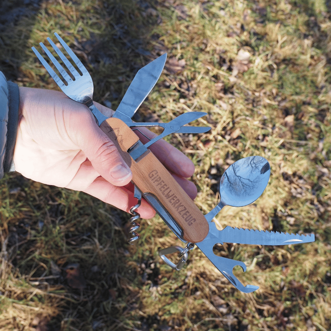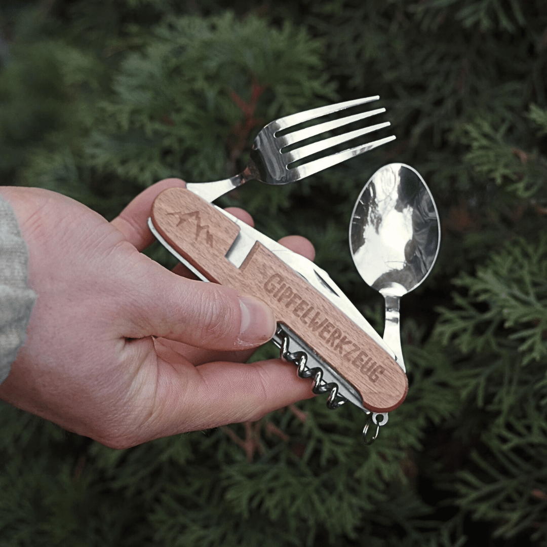Stressfrei in dein Abenteuer starten – mit nur einem Griff hast du alles dabei. Egal, ob du am Gipfel Käse schneidest, Nudelsalat isst, Suppe löffelst, eine Gurke oder Tomate aufschneidest oder dein Gipfelbier öffnest – dein Gipfelwerkzeug ist dafür das ideale Tool.